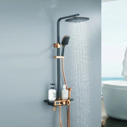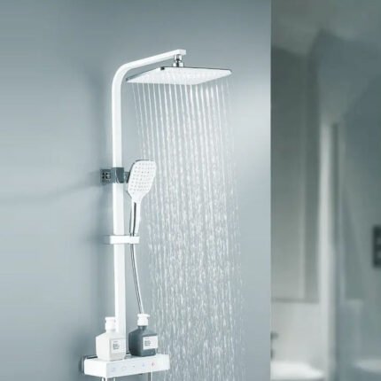 Premium brass thermostatic rainfall shower faucet set with single-handle control and constant temperature system. Designed for safety, comfort, and a luxurious shower experience in modern bathrooms.