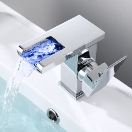 Modern LED waterfall basin faucet with a sleek square design, featuring temperature-sensitive LED lighting and smooth hot & cold water control. Made from durable stainless steel, it adds luxury and functionality to any modern bathroom.