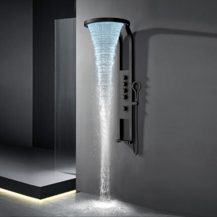 Luxury LED digital shower panel system with multiple water functions, temperature display, and sleek modern design. Built from durable stainless steel, it delivers a spa-like experience with rainfall, waterfall, body jets, and handheld shower.