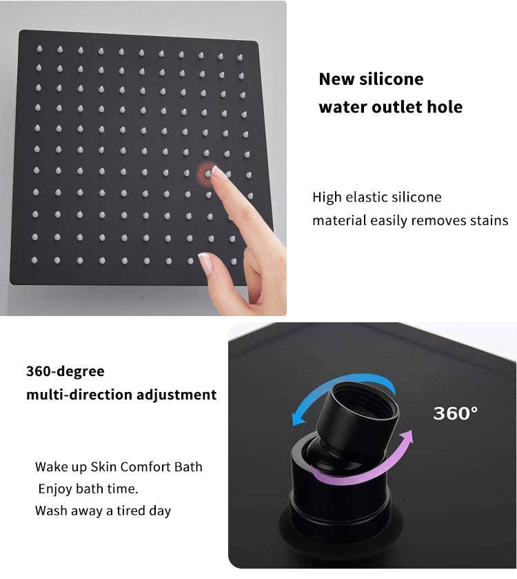The wide square surface design (typically 8–12 inches or more) ensures full-body water coverage, creating a relaxing rainfall effect that mimics natural rain. This design distributes water evenly across the entire body, enhancing comfort and delivering a luxurious bathing experience.