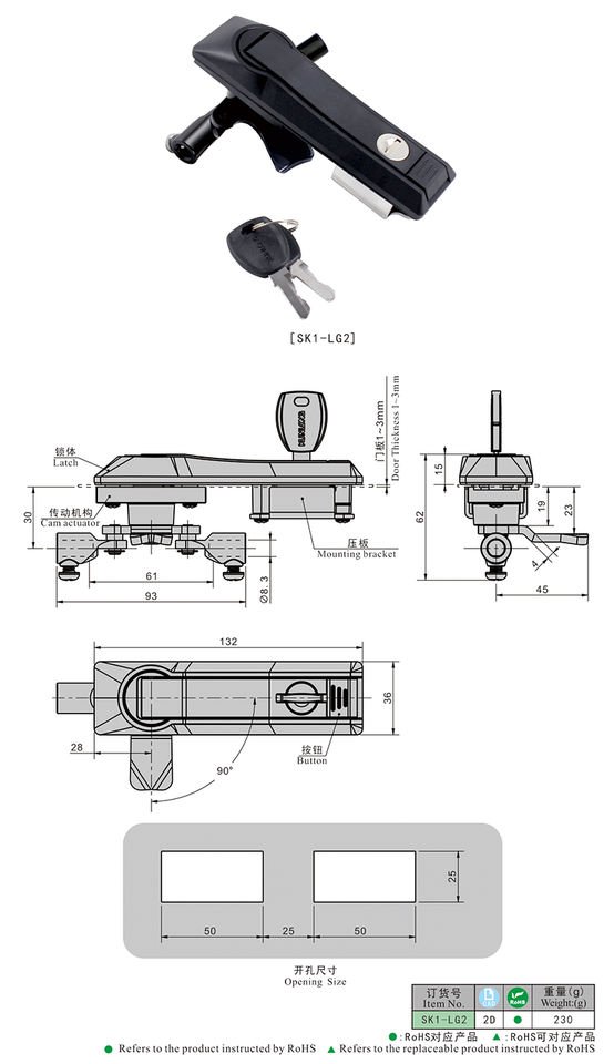 Additionally, the lock is available in various finishes such as chrome plating, black powder coating, or nickel plating, offering both durability and a professional appearance. Its versatile design supports different mounting configurations and panel thicknesses, ensuring compatibility with a wide range of applications.